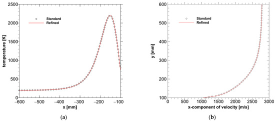 In order to verify that the DSMC results are independent of the grid and the time step, a refined grid and a reduced time step size (the last column in Table 2) are used to redo the DSMC simulation of the sphere flow under the condition of W = 0. Figure 6 compares the DSMC results using the standard and the refined grids. Flow variables along Line 1 and Line 2, marked in Figure 5, are extracted for comparison. The temperature profiles along Line 1 are plotted in Figure 6a, and the velocity profiles along Line 2 are shown in Figure 6b. The comparisons indicate that the DSMC simulations with different computational parameters yield almost indistinguishable solutions. Thus, in the remainder of this paper, the DSMC parameters all follow the standard settings.