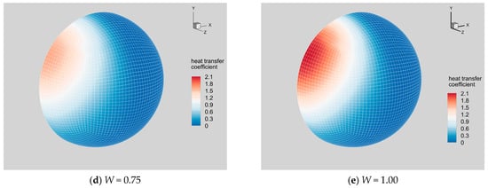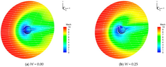 The flow fields under conditions of W = 0.00, 0.25, 0.50, 0.75, and 1.00 are displayed in Figure 7a–e, respectively. Under the hypersonic rarefied flow conditions of M∞ = 10 and Kn∞ = 0.51 (or, equivalently, the Reynolds number Re∞ = 22), the flow features are distinct from their counterparts in the continuum flow regime. For all cases considered here, no flow separation is observed. Each flow field is highly diffusive, in which the shock wave and the boundary layer are substantially thickened and smeared, merging into one smooth zone around the sphere. No discontinuity exists in such a flow field, but the term “shock wave” is still used here to denote the front of the compression wave upstream of the sphere. In addition, there are remarkable velocity-slip phenomena on the wall surface, so the gas flow velocities on the sphere differ from the moving wall velocities.