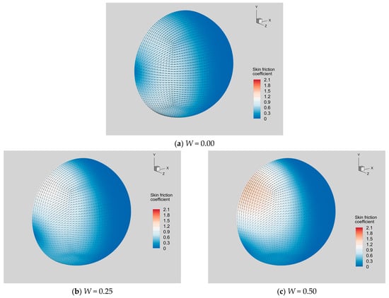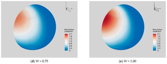 When the sphere is at rest (Figure 8a), the distribution of the shear stress vector on the sphere is axisymmetric. As the rotation speed increases (Figure 8b–e), the symmetry is broken significantly, and the strength of skin friction is enhanced. The point of Cf = 0 departs the leftmost pole on the sphere and moves toward the bottom. The region with a large magnitude of Cf is mainly the upper half of the windward side, where the directions of shear stresses are basically upward. The resultant force of these shear stresses becomes a lift Fy exerted on the sphere, directed toward the positive y-axis.