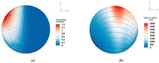 These findings can be explained by comparing the distribution of shear stress with the field of relative velocity on the sphere. In Figure 9a, the magnitudes and directions of the wall shear stresses under the condition of W = 0.5 are demonstrated. In Figure 9b, the relative velocity is the difference between the absolute gas velocity shown in Figure 7c and the linear velocity of the rotating wall surface. It can be observed that the direction of wall friction coincides with the direction of gas motion relative to the spinning sphere. The point at which Cf = 0 is just the point where the gas velocity equals the wall velocity. According to the gas-kinetic interpretation of wall shear stress, the magnitude of τw(xw) is determined by the combining effects of the incident mass flux on the wall and the magnitude of relative velocity. The incident mass flux is large only on the windward side, while the relative velocity is large only on the top of sphere. As a result, strong friction is concentrated on the upper half of the windward side, where the tangential momentum transfer between the gas molecules and the wall surface is rapid and effective.