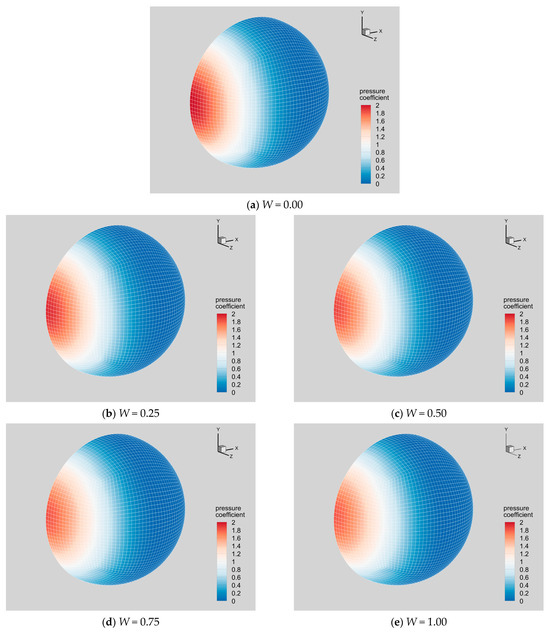 Figure 10 demonstrates the contours of Cp on the sphere. For the stationary sphere (Figure 10a), the distribution of wall pressure is axisymmetric. The high pressure is concentrated on the windward side, with the maximum pressure appearing at the leftmost pole of the sphere. The variation of pressure distribution with the rotation parameter is shown in Figure 10b–e. The distribution of wall pressure remains symmetric when the sphere rotates, in contrast to the velocity field shown in Figure 7. As W increases, the position of the maximum pressure stays unchanged, but the magnitude of Cp declines slightly.
