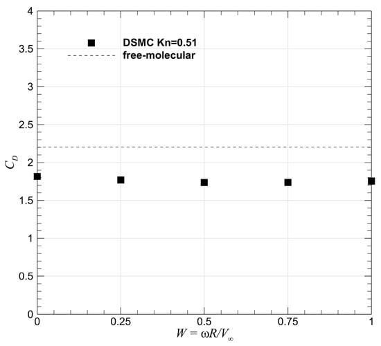 Figure 12 shows the drag coefficients computed through the DSMC method for different values of W, along with the theoretical solution under the free-molecular assumption. In comparison with the free-molecular solution, the simulation data are lower. This discrepancy is reasonable, because the flow Knudsen number Kn∞ considered in this paper is only 0.51, while the commonly-used criteria for the free-molecular regime is Kn∞ > 10. However, the variation tendency of CD with the growth of W is similar to the free-molecular solution. As W increases, the drag of the sphere stays almost constant.