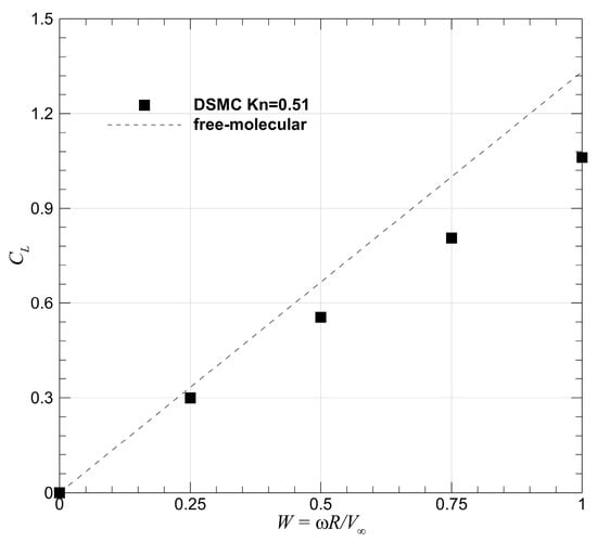 which indicates that CL increases in proportion to W. Figure 13 displays the CL–W plots for both the free-molecular and the DSMC solutions. At Kn∞ = 0.51, the relation between the lift and the rotation speed is qualitatively similar to that in Equation (6), but the slope is smaller than 4α/3. Again, this is because the rarefaction of the simulated flow is not strong enough to satisfy the free-molecular assumption underlying Equation (6).