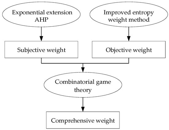 The basic aim of game theory is to find the best result that considers both subjective and objective weights by adjusting the conflicts between different weights, thus achieving Nash equilibrium. Therefore, the comprehensive weight calculation flowchart of each factor is shown in Figure 2. This method not only reduces the subjective arbitrariness but also keeps the result close to the fact; this makes the weight values of indicators more reasonable [].