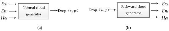 A cloud generator is utilized for the realization of a transformation between qualitative concepts and quantitative values. According to the direction of transformation, this is divided into a forward cloud generator and a reverse cloud generator []. The forward cloud generator transforms qualitative into quantitative, where cloud parameters (Ex, En, He) are used to generate cloud droplets (xi, yi). The reverse cloud generator performs the opposite process, transforming cloud droplets (xi, yi) into cloud parameters (Ex, En, He), as shown in Figure 3.