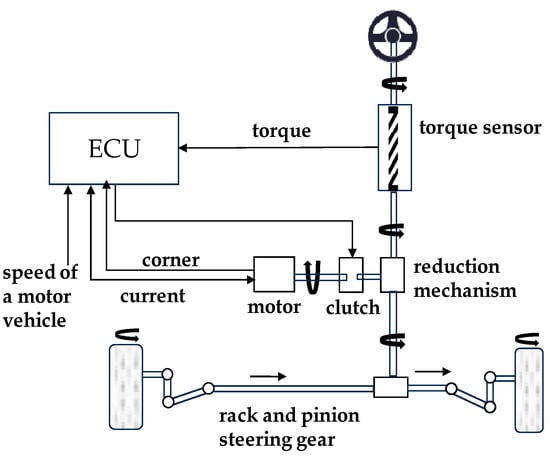 The EPS is based on the traditional mechanical steering system; according to the torque signal on the steering wheel and the driving speed signal of the car, the electronic control device is used to make the motor generate auxiliary power with a corresponding magnitude and direction to assist the driver with steering []. Compared with the traditional hydraulic power steering system, the EPS has several advantages: it saves energy, aids in environmental protection, has convenient assembly, high efficiency, a good feeling on the road, and good reversion, and has excellent application and development prospects []. This paper takes the EPS system presented in reference [] as the research object analyzes its performance, and determines its grade. A diagram of this EPS’s structure is shown in Figure 4.