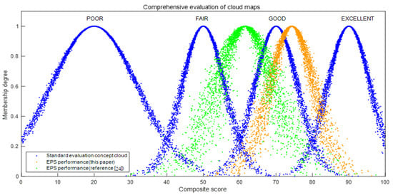 In order to verify the accuracy of the evaluation method in this paper, a comparison is made with reference [] at the end of the case analysis. Reference [] uses the fuzzy evaluation method improved by cloud theory to comprehensively evaluate the target. The EPS comprehensive cloud parameter obtained in this paper is U (ExV, EnV, HeV) = U (74.31, 6.08, 0.96), which indicates that the EPS’s overall situation is closer to good; however, the calculation result in reference [] is U (ExV, EnV, HeV) = U (61.44, 7.68, 1.98) and the results are shown in Figure 5 (green), which indicates that the EPS cannot reach the GOOD level and needs to be properly disassembled for maintenance.
