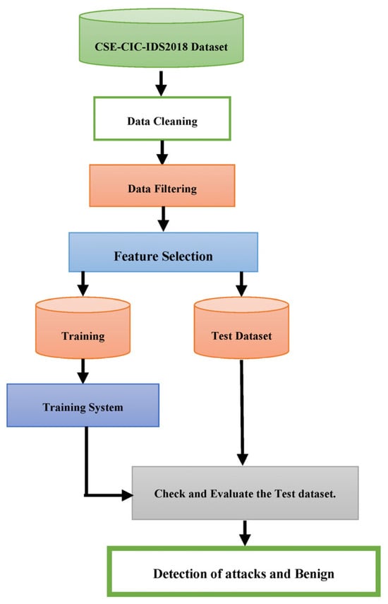 The CSE-CIC-IDS2018 dataset consists of 10 files collected over consecutive days. The resulting dataset contained 16,232,943 records and 80 features upon merging these files. Following the data cleaning process, 16,137,168 records and 67 features remained in the dataset. For the data filtering step, we utilized this enhanced dataset. Of the entire amount of records collected (16,137,168), we reserved 3,227,433 records (20 percent) for system testing and assessment, and we assigned 12,909,735 records (80%) for system training.