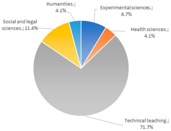 The methodological approach of this research is quantitative. The sample consists of a random selection of 734 MOOCs on AI from the last 5 years from the following platforms: Coursera (654), Edx (75), and MiriadaX (5). They can be divided into five macro-reference areas (Figure 1): experimental sciences (64/734), health sciences (30/734), technical teachings (526/734), social and legal sciences (84/734), and humanities (30/734).