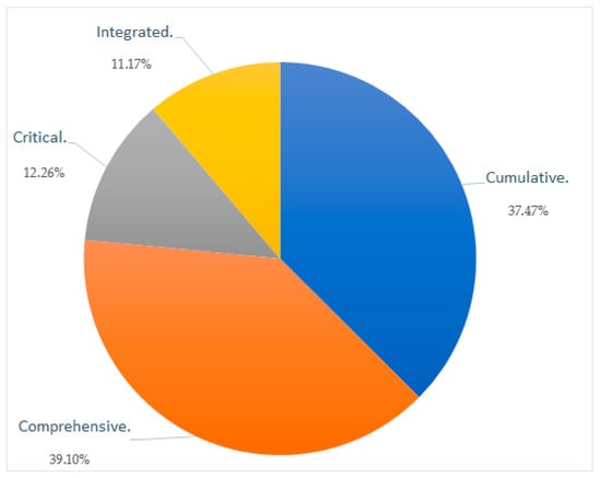 In the methodology subcategory, regarding the description of the teaching activity (DID.MET.01), in only 38/734 of the courses did the teacher actively act as a guide. In other words, there is an almost total predominance of a passive teacher and the dispensing of content (696/734). The details of students’ workload (DID.MET.02) are present in all courses, while the participation in the activities (DID.MET.03) is individual in 694/734 courses. Although previous research recognized the benefits of critical thinking in learning [38], 75.6% of courses from the sample are cumulative or comprehensive, and do not include elements that encourage the construction of critical competence. Thus, the type of learning (DID.MET.04) is predominantly cumulative in 275/734 courses, compressive in 287/734, critical in 90/734, and integrated in 82/734 courses (Figure 2). Regarding the degree of complexity (DID.MET.05), it is constant in 350/734 courses and ascending in 384/734.