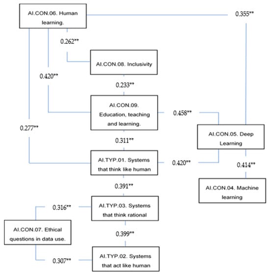 Despite the absence of high correlations, there are medium–low correlations that have been selected for their statistical significance (correlation is significant at the 0.05 level [bilateral]) and for their special interest in research, such as correlations with “AI.CON.07. Ethical questions in data use” and with “AI.CON.08. Inclusivity”. The importance of the ethics of AI for researchers and policies is considered [14,44], highlighting that the ethics of AI lies in the ethical quality of prediction, the end outcomes, and the impact on humans. The selected correlations have been organized in the correlational structure shown in Figure 3. This correlation structure implies a visual image of the main correlations of the study in relation to the AI block and is complementary to the establishment of the emerging profiles of MOOCs on AI supported by principal component analysis.