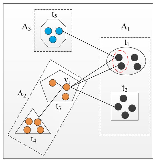 - Selecting a target attribute type t. Sampling one attribute type t from those that have nodes connected to via heterogeneous edges. The candidate set of attribute types for selecting is denoted as . According to the node type of , can be divided into two parts, and , which are denoted aswhere is the node type of . contains the attribute types of the node which has the same node type as , and otherwise. For example, in Figure 2, , and .