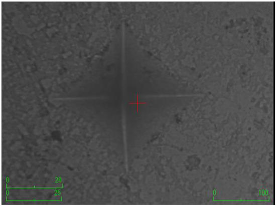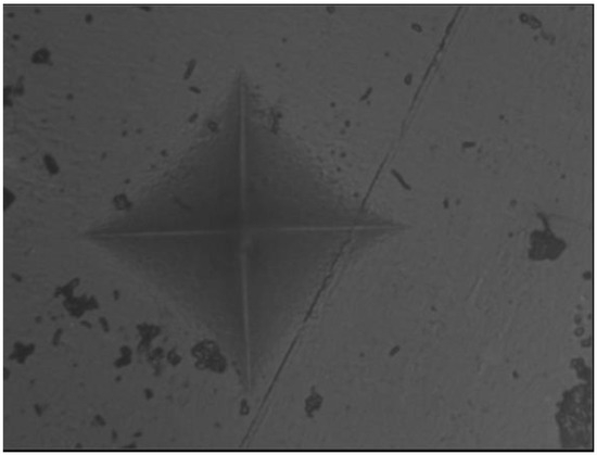The samples were prepared using Teflon molds (2 mm width × 5 mm diameter) (n = 7). A mylar strip was initially placed on a microscope slide, followed by the arrangement of mylar strip and microscope slide successively onto the Teflon mold. The discs were obtained by carefully placing composites into the Teflon mold using a titanium spatula to ensure the absence of air bubbles. The prepared samples were incubated at 37 °C for 24 h. Before conducting measurements, the top surface of the composite discs underwent a precision finishing and polishing procedure utilizing a low-speed micromotor and a specialized finishing-polishing kit (Sof-Lex Disc 3M ESPE, St. Paul, MN, USA). This process aimed to establish a consistent measurement area and ensure standardization. Subsequently, a Vickers hardness testing machine (Shimadzu, HMV-G31D, Shimadzu Corporation, Kyoto, Japan) was employed for hardness measurement. The hardness measurements were conducted on both the upper and lower surfaces of the composite discs. The test load of the machine was set at approximately 1 N with a holding time of 15 s. The measurements were taken from 3 random regions with a distance of 150 µm between edges. The area of the resulting rhombus on the disc surface was calculated using the machine. The arithmetic average of three measurements was recorded as the Vickers hardness number (VHN) for both upper and lower surfaces. The surface microhardness was assessed using the equation: H = 1854.4 (Pd−2), where H denotes the Vickers hardness (kg/mm2), P represents the applied force (g), and d signifies the average length of the diagonals (µm).