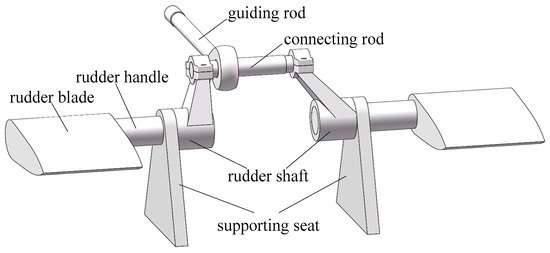 The rudder of an underwater vehicle consists of an elevator and a rudder, and the rudder device is mainly arranged outside the pressure-resistant steering engineering room and pressure-resistant shell. An elevator is a device for underwater vehicles to maintain and change depth and is mainly divided into a front elevator and a tail elevator. The rudder blades of the first elevator are symmetrically arranged on both sides of the front or command room enclosure, with a smaller rudder surface and less rudder force. The rudder blades of the tail elevator are symmetrically arranged on the front (or rear) surface of the shaft propeller. The rudder blade surface is larger than that of the front rudder and is directly affected by the water flow of the propeller, generating a greater rudder force. It is the main elevator for underwater operation. The mechanical part of the rudder is used alone with the electrical control part of the steering subsystem or in conjunction with the tail elevator to maintain or change the depth and pitch attitude of the underwater vehicle [5]. Functionally speaking, the rudder is used to change or maintain the heading of underwater vehicles, while the elevator is mainly used to change or maintain the depth of underwater vehicles during navigation. The working principle is to change the attitude or state of underwater vehicles through the action of the rudder force and torque, thereby changing the force and achieving the goal of changing or maintaining the heading and depth [6]. Essentially, the control of the entire rudder device belongs to the position servo control system. Taking the elevator as an example, it consists of rudder blades, a rudder stock, a rudder handle, a guide rod, a guide device, a transmission rod, an implementing press, a hydraulic steering system, etc.