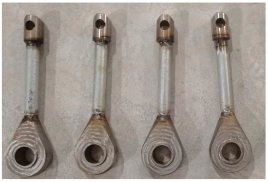 Through the research and review of information, it was found that the guiding rod of the rudder stock mechanism is composed of a rod head, a rod, and a joint connected by welding, and the composition of the structure and dimensions are shown in Figure 3. The rod head and joints for the ship are made of 925A forged steel, the rod material is ordinary 20 structural steel, and the welding material for the ship welding is 395. Considering the installation and positioning, here, the design to be welded to the installation is conducive to the assembly mechanism and positioning of the welding. Welding has a certain impact on the fatigue life of the welded structure mechanism, which may be due to the material properties, welding quality, and loading methods, such as the information of cracks in the structure. Therefore, it is considered that during manufacturing, installation, or use of the rudder mechanism, there may be some sudden changes in the geometry, material defects external damage, etc., which lead to the concentration of stresses in localized areas. These stress concentration points will become fatigue crack growth areas, and, with time, the cracks will gradually expand, eventually leading to the failure of the mechanism. As the rudder bar is an important component of the rudder system mechanism, structural stress analysis of it is crucial to the entire mechanism.