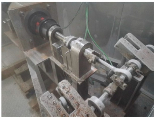 The overall design scheme of the test bench is as follows: take the servo motor as the power source, drive the speed reducer through the torque-type method of control, turn the rotational force into thrust through the screw, and then realize the reciprocating motion of the underwater vehicle rudder bar mechanism by PLC programming. The motor and reducer form a whole system, which generates a corresponding change in rotational speed and forms a certain torque. It can deliver power to the drag object to obtain the desired torque and speed. The physical object processed by the test bench is shown in Figure 5, and this scene is that of the object being placed in a polar environment simulation laboratory during the experiment. The rudder stock specimens used for the experiment are shown in Figure 6. The experiment was conducted at four temperatures: room temperature (20 °C), 0 °C, −20 °C, and −40 °C. It simulates the operating frequency of the rudder in reality, with an applied frequency of 15 Hz and a duration from installation to fracture, and calculates its fatigue loading frequency.