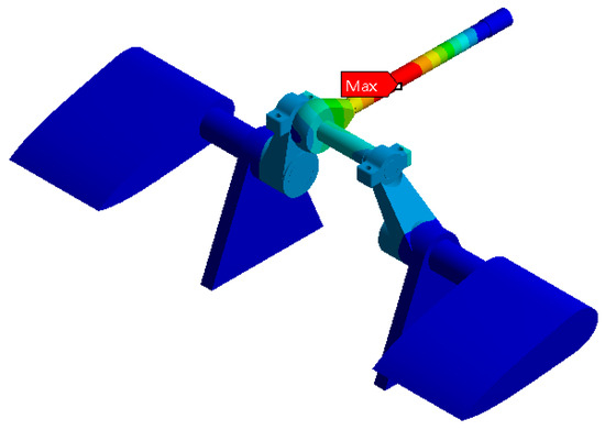 As mentioned earlier, the rudder stock is welded from two materials, with the rudder stock head and joint made of 925A and the middle pull rod made of 20# steel. The density of 925A is 7.938 g/m3, Young’s modulus is 2.13 × 105, and the Poisson’s ratio is 0.3. The density of 20# steel is 7.84 g/m3, Young’s modulus is 2.06 × 105, and the Poisson’s ratio is 0.282. The mechanical performance parameters of the material are detailed in Table 1. After defining the material properties, the tetrahedron is used to divide the grid. To explore the convergence of finite element meshing, this paper refers to the computing power of the computer and sets a total of five unit sizes of 5 mm, 7.5 mm, 10 mm, 12.5 mm, and 15 mm for comparative experiments. According to the comparison results of the above five groups of unit sizes, it is finally confirmed that an obvious stress singularity phenomenon occurs after the unit size is less than 5 mm, that is, as the unit size decreases, the total deformation size increases rapidly. Therefore, the resolution of the finite element analysis is finally set to 5, and the unit size of the finite element analysis is 10 mm. Based on this parameter design, the automatic partitioning function generates a total of 19,156 nodes and 78,580 units. The first step in strength analysis is to perform static analysis on the structure. The static structure module is used for static analysis, and deformation and stress are set as solving terms. The results show the equivalent stress of the rudder system structure in a static state, as shown in Figure 8.
