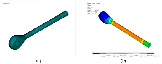 Mesh delineation and static stress simulation analysis of the rudder: (a) tie rod grid division; (b) static stress analysis of tension rods in ANSYS.