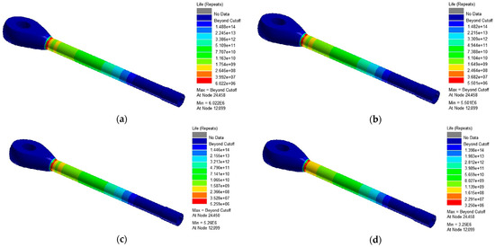 Fatigue life cloud of the rudder bar at different temperatures: simulation and analysis of the fatigue life of the guide rods at (a) 20 °C (b) 0 °C (c) −20 °C, and (d) −40 °C.