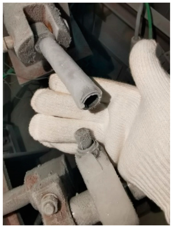According to the above experimental steps, when the test was terminated, the rudder bar specimens were checked for fatigue fracture location, and all of the fractures were found at the guide tie rod step, which was consistent with the results of the previous static calculation of the rudder bar mechanism. In the actual test process, the stress value at the guide rod step is larger, and after a long period of cyclic loading, due to the low temperature and multiple ice-cover effects, cracks will first occur at this location. With time, the cracks continue to expand eventually leading to fatigue fracture. The rudder bar specimen fracture at −40 °C is shown in Figure 11.