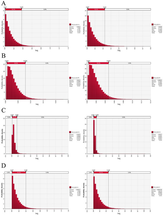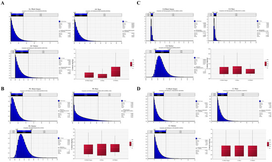 The distribution of residual heavy metals in auriculus auriculus samples from different collection links was simulated, and each simulation process was repeated 10,000 times. The simulation results of residual heavy metals in auriculus auriculus samples from different sources showed that the residual heavy metals in auriculus auriculus samples collected from bases and markets showed a distribution state of low residual concentration and partial extreme values. Figure 1A shows that the MRL value of As in black fungus after simulation is 1.021 mg·kg−1, the minimum value is 0.004 mg·kg−1, the average residual amount is 0.110 mg·kg−1, and the 90% confidence interval is mainly distributed in the range of 0.010–0.320 mg·kg−1. The maximum residual amount of As in the base sample was 0.889 mg·kg−1, the minimum value was 0.004 mg·kg−1, and the average value was 0.085 mg·kg−1. The 90% confidence interval was mainly distributed in the range of 0.009–0.244 mg·kg−1. The maximum residual amount of As in market samples was 1.986 mg·kg−1, the minimum value was 0, the average value was 0.205 mg·kg−1, and the 90% confidence interval was mainly distributed in the range of 0.010–0.616 mg·kg−1. The residual amount of As in black fungus collected in the market is relatively higher than that in the base, and the probability of an extreme value is relatively high, but the results show that the difference between the sampling links is not significant, that is, the sampling link has no significant impact on the content of heavy metal As.