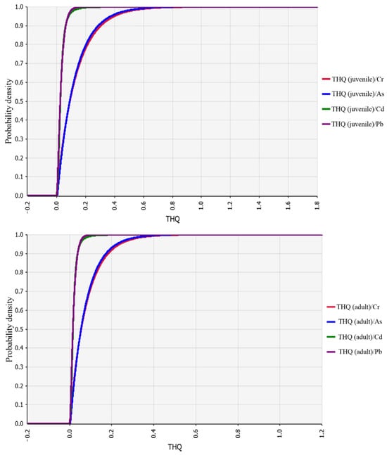 The @Risk 8.0 software was used to simulate the distribution of heavy metal residues in 179 dried black fungus. Each simulation cycle was 10,000 times. The simulation results showed that the residual distribution of heavy metal As in black fungus met the exponential distribution, denoted as RiskExpon (0.10546, RiskShift (0.0044109). The distribution of Cd residue satisfies the logical distribution RiskLoglogistic (−0.012793, 0.088553, 2.8455), The residual Pb distribution meets the gamma distribution RiskGamma (1.5252, 0.19681, RiskShift (0.01518), Cr residue distribution meets exponential distribution, denoted RiskExpon (1.1386, RiskShift (−0.0013609). The residual heavy metal data and other relevant exposure parameters were substituted into the formula, and the risk probability distribution of heavy metal ingestion by black fungus in Chinese minors and adults was calculated using @Risk 8.0 software. Each simulation cycle was 10,000 times, the results are shown in Figure 2. The average risk quotient of As ingested by black fungus in minors was 0.128, the minimum value was 0.005, and the maximum value was 1.204. The 90% confidence interval was mainly distributed in the range of 0.011–0.374. The average risk quotient of As ingested by black fungus in adults was 0.077, the minimum value was 0.003, and the maximum value was 0.717. The 90% confidence interval was mainly distributed in the range of 0.007–0.223. The average risk quotient of Pb ingested by black fungus in minors was 0.032, the minimum value was 0.002, and the maximum value was 0.230. The 90% confidence interval was mainly distributed in the range of 0.005–0.079. The average risk quotient of Pb ingested by black fungus in adults was 0.019, the minimum value was 0.001, the maximum value was 0.135, and the 90% confidence interval was mainly distributed in the range of 0.003–0.047. In addition, the average risk quotient of minors ingesting Cd through black fungus was 0.034, the minimum value was 0, the maximum value was 0.848, and the 90% confidence interval was mainly distributed in the range of 0.007–0.083. For adults, it was 0.020, 0.0820 and 0.004–0.049, respectively. The mean, minimum, maximum and 90% confidence intervals of Cr ingest by black fungus in minors and adults were 0.133 and 0.079, 0 and 0, 1.443 and 0.817, 0.007–0.398 and 0.004–0.238, respectively.