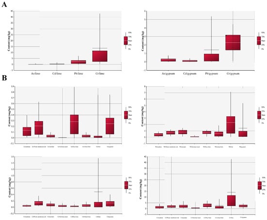 (A) Residual As of four heavy metal residues in lime and gypsum based on Monte Carlo simulation. (B) Residual As of four heavy metal residues in different raw and auxiliary materials based on Monte Carlo simulation.