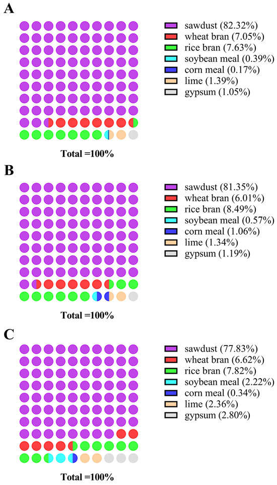 (A) Contribution rate of raw and auxiliary materials to lead in Auricularia heimuer. (B) Contribution rate of raw and auxiliary materials to cadmium in Auricularia heimuer. (C) Contribution rate of raw and auxiliary materials to chromium in Auricularia heimuer.