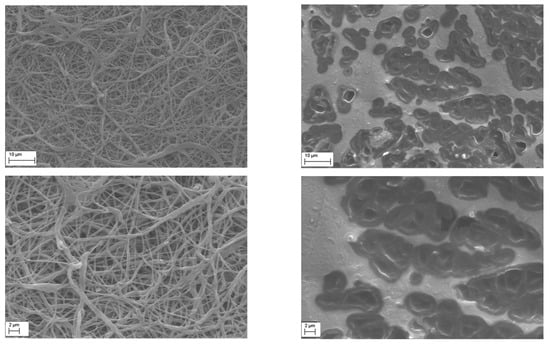 In our experiment the combination of the used solvent mixture (CHCl3/DMF), the distance between the syringe tip and the grounded drum collector, and the flow rate of 3 mL/h produced a scaffold where fibers in the presence of flat polymer ribbons are present (SEM micrograph of Figure 3 on the left). The soaking of the membrane with EMIMBF4 resulted in a modification of membrane morphology, as shown through the SEM micrograph (Figure 3 on the right) in which the IL, filling the pores of the PCL scaffold, is present as a continuous phase that wets the fibers and ribbons.