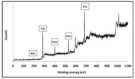 To determine the actual presence of EMIMBF4 on the sample surface, we analyzed the composition of the soaked PCL surface through X-ray photoelectron spectroscopy (XPS). The wide scan shown in Figure 4 evidenced that carbon, oxygen, boron, nitrogen, and fluorine are present on the sample surface. The peaks centered at about 187 (B1s), 400 (N1s), and 685 eV (F1s), which derive from emerging on the surface of the IL.