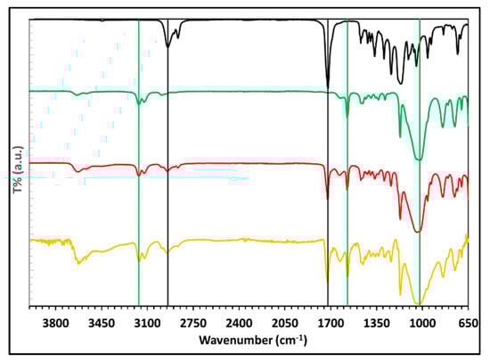 ATR FTIR spectra of PCL (black), EMIMBF4 (green), PCL/EMIMBF4 (red), and PCL/EMIMBF4/Ag (yellow) samples.