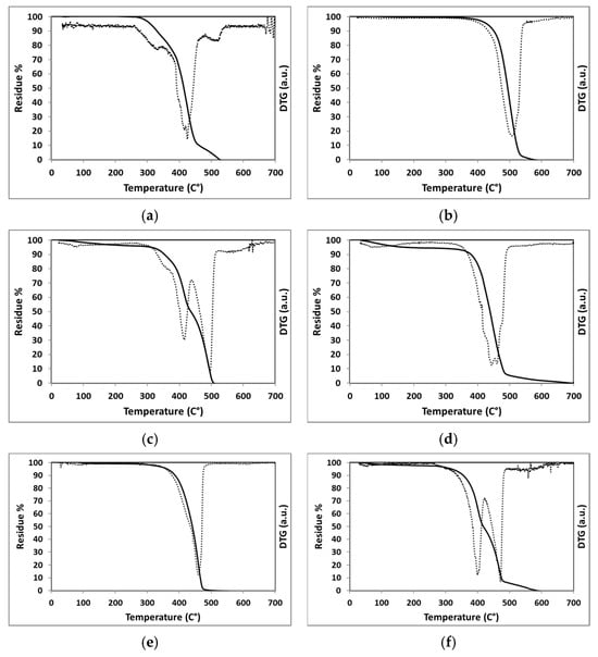 TGA (continuous line) and DTG (dashed line) plots of the PCL membrane as electrospun (a), EMIMBF4 (b), the PCL membrane soaked with the EMIMBF4 (c), and the soaked membrane coated with silver-based electrodes (d), EMIMBF4 in static air with a ramp of 10 °C min−1 (e), and the PCL membrane soaked with the EMIMBF4 in static air with a ramp of 10 °C min−1 (f).