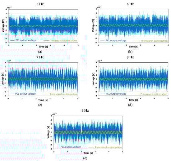 The evolution of the sensor’s output voltage, maintaining a constant RMS vibration level of approximately 1.4 mm while changing the frequency, which is detailed below, at the values as follows: (a) at 5 Hz, (b) at 6 Hz, (c) at 7 Hz, (d) at 8 Hz, (e) at 9 Hz. Each graph showcases the approximation using a sinusoidal waveform obtained through the MATLAB® function of fminsearch.