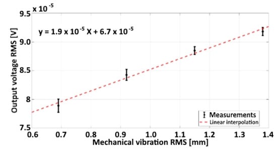 Figure 9 presents the RMS output voltage of the device corresponding to different RMS mechanical vibrations. Each data point includes the mean value and the experimental standard deviation, which is derived from 10 repetitions. During the characterization, a time window of 5 s was considered for each repetition.