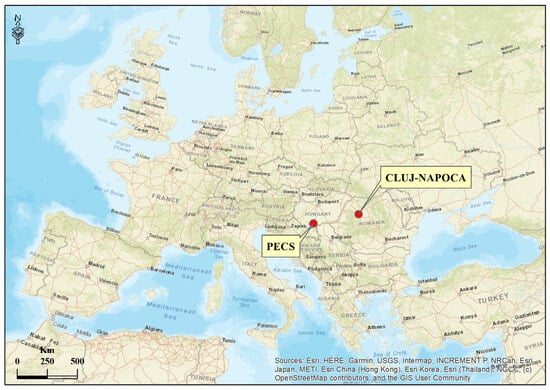 The economic space of Eastern Europe is dominated by urban areas, leading to a top-down diffusion of modernisation and innovation from the highest levels of the settlement hierarchy [32]. The geographical focus of the study is two regional centres of Romania and Hungary (Cluj-Napoca and Pécs) (Figure 1), which can be defined as having a high priority for changes in the settlement network: the establishment of new states and new capitals, positive changes in the cross-border mobility of states, and new neighbourhoods [33].