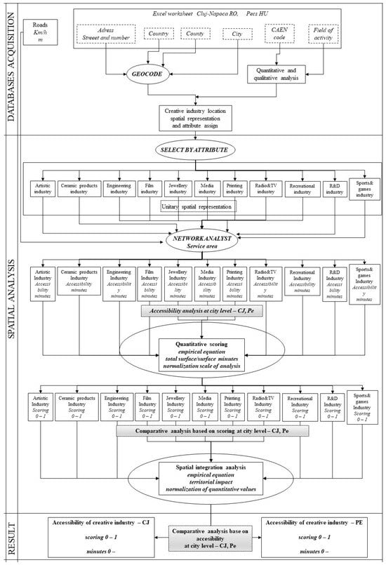 The main aim of the present investigation is to propose a GIS model for spatial analysis that allows for the comparative analysis of two urban centres that are different in terms of the spatial extension, shape, and placement of analysed infrastructures, namely Cluj-Napoca, Romania, and Pécs, Hungary. The focus of the study is the spatial distribution of creative industries (as territorially arranged test infrastructures), using network analysis as the main methodological approach to identify their cumulative impact in terms of accessibility. In order to achieve the proposed main objective, an integrated geographic information system (GIS) model for spatial analysis has been developed, focusing on pedestrian accessibility in view of the role of the recently developed and implemented 15 min cities concept in large urban centres.