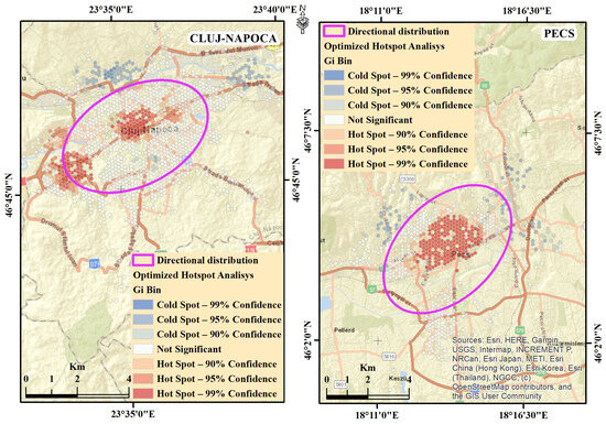 The spatial arrangement of creative industries within cities reveals two different patterns in terms of their clustering—patterns that directly influence the spatial arrangement of accessibility ranges. The analysis of hot-spot clusters brings to the fore the clustering in a single hot-spot identified near the centre of Pécs. Instead, three main hot-spots can be identified in the city of Cluj-Napoca: a very well-connected hot-spot in the centre of the city; a hot-spot in the eastern part of the city spatially identified with the largest block of flats (Mănăștur district) in Cluj-Napoca—thus, in one postal code, several creative industries are identified, but they are on different floors; and a hot-spot in the making (the Grigorescu neighbourhood)—an expanding neighbourhood where many commercial companies have their headquarters but operate in other locations (Figure 3). From the point of view of the spatial arrangement of the cold hot-spots, the city of Cluj-Napoca stands out with such a hot-spot in the northern part; a hot-spot developed due to the expansion over large areas of neighbourhoods with individual homes; and a cold hot-spot in the immediate vicinity of the airport, where more storage spaces and less creative industries are identified. Approximately the same directional distribution is identified in the NE/SW direction imprinted by the inner-city development of the two cities, around the main transport axes that serve them.