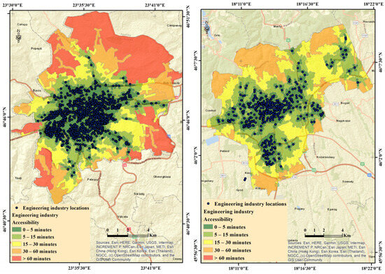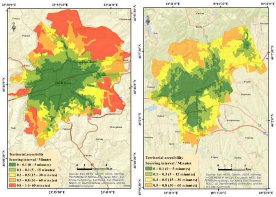 These spatial differences have a direct impact on the accessibility of the territory. It can be noticed that the territorially extended areas, with accessibility in the range 0–15 min, are compact in the centre and close to the city centre. Within the city of Pécs some areas of discontinuity are identified, generated by administrative annexes and the construction of districts linked to coal and uranium mines. Discontinuity and location of industry types throughout the administrative territory adds value to territorial accessibility, which was identified in the city of Pécs where the maximum accessibility is in the range of up to 30 min, while for the city of Cluj-Napoca access times of more than 60 min were calculated for large areas, thus inducing territorial dysfunction in terms of engineering industry.