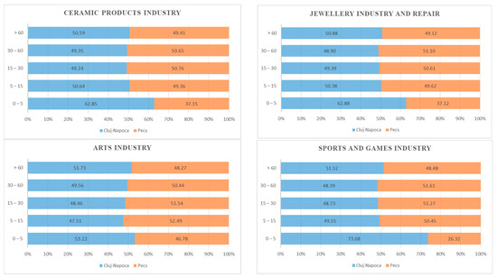 The other types of creative industries have a similar spatial distribution within the cities, being mainly located near the centres, giving them good accessibility, within the range 0–15 min. For the city of Pécs, the distribution of creative industries is divided into three main clusters: a cluster in the central area of the city, a cluster in the eastern area and a cluster in the south of the city, which does not affect accessibility in terms of time, whereas for the city of Cluj-Napoca, there is a general clustering of industries with development from the peripheral neighbourhoods towards the centre.