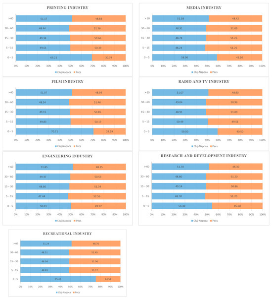 The comparative analysis at the level of the type of creative industry highlights the high weight of the engineering industry and the research and development industry, which have relatively close weights—over 50%—in both urban centres. This highlights the role of the centre of innovation and application of practical technologies in the complex process of sustainable development of the urban centres analysed. The sustainability of the polarising urban centres is also highlighted by the offer, materialised in leisure and entertainment activities addressed to residents and commuters. The two urban centres have a varied and relatively similar offer, materialised in the media industry with a plus for the city of Cluj-Napoca—a plus that emerges from the character of its information hub, the arts industry (with a higher share in the city of Pécs, mainly related to the European Capital of Culture investments projects (Zsolnay District, Kodály Centre, Knowledge Centre and Library)), and the recreational industry.