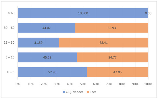 From the point of view of comparing the spatial extension of the accessibility intervals, the interval of more than 60 min stands out very clearly, which, in the case of Cluj-Napoca, characterises the northern and eastern territorial areas, while in the case of Pécs, it is missing. The lack of an accessibility interval of more than 60 min highlights the good management of spatial resources in terms of access infrastructure but also in terms of the territorial distribution of housing and related infrastructures, which are located near the industrial hubs developed in recent years.