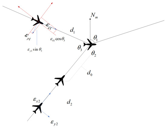 In the formula, indicates that the angle of the two aircraft’s routes when they are heading to the intersection, is the distance along the trajectory of the trailing aircraft from the intersection when the front aircraft is at the intersection considering the position error; is the total position error along the direction of and across the direction of d0 when the leading aircraft is at the intersection, of which ; is the speed of the two aircraft, is the along-trajectory error of the two aircraft, and is the across-trajectory error of the two aircraft.