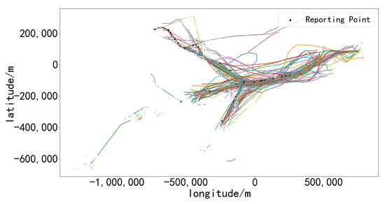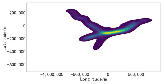 Position error primarily signifies the degree of deviation of an aircraft from its intended flight path. It can be categorized into errors along the trajectory and errors across the trajectory in the horizontal plane. To streamline the analysis, we assume these errors are uniform and focus on calculating errors across the trajectory. In this study, we examine flight data of aircraft at an altitude of 8900 m in the LLC intersection airspace near Changsha. To facilitate analysis, latitude and longitude data are converted into plane coordinates using the Lambert projection method, as illustrated in Figure 2. Subsequently, the coordinate points are sorted based on their density values. To focus on the most relevant trajectory data, the top 95% of points by density value are selected. This step eliminates data points that significantly deviate from the intended routes, ensuring that our analysis is concentrated on high-density trajectory data. The density maps resulting from this screening process are shown in Figure 3.
