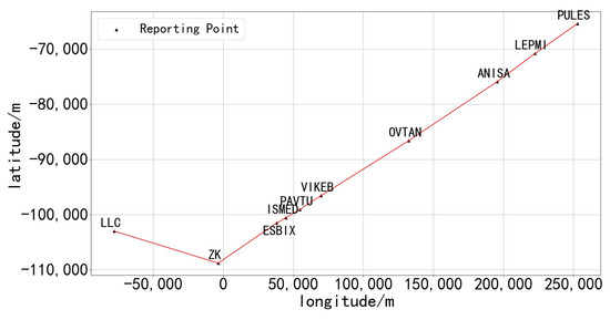 The filtered data undergo further processing to determine the deviation distance of each waypoint from the intended route. In analyzing the route configuration, it can be observed that multiple routes converge at the intersecting points. For the purpose of this paper, we focus on analyzing the characteristics of eastward-bound flights at an altitude of 8900 m to delineate these routes. Routes leading up to the intersection are collectively termed as ‘inflow routes’, while the singular route beyond the intersection point is referred to as the ‘converging route’.
