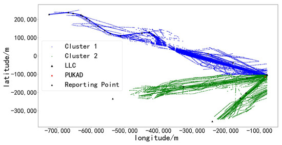 First, each reporting point on the converging route is fitted as shown in Figure 4, and the distance from each waypoint to the fitted route can be calculated directly. The inflow routes involve multiple classes of flight trajectories; in order to better distinguish them, the azimuth of the data points into the intersection is selected as the criterion for clustering. K-means clustering is employed to organize the data points into distinct groups, subsequently named Cluster1 and Cluster2, as depicted in Figure 5. Notably, Cluster2 comprises two inflow routes that are grouped into a single category. This classification is due to both routes converging at the PUKAD reporting point, which is located just before the LLC intersection, and following the same path towards the intersection. By categorizing the data points in this manner, we can precisely calculate the deviation distance for each track point along the respective inflow routes.