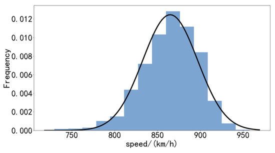 Equation (4) reveals that the primary variable parameters of the function are the initial distances of each aircraft from the intersection () and the distribution function followed by , with a subsequent discussion on speed. This paper includes an analysis of aircraft speeds at the 8900 m altitude level at the LLC intersection, the results of which are shown in Figure 6: