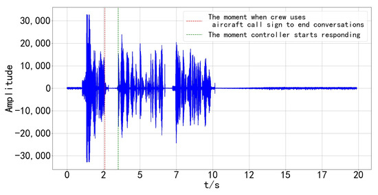 Field research was conducted at the air traffic control unit, utilizing real-time voice data files from its professional voice recording system for analysis. The data, consisting of fragmented conversations in ground-air communication, were amalgamated with vocal characteristics to examine the thinking and reaction times using a waveform graph. During these thinking and reaction processes, the audio amplitude on this waveform graph typically hovers around the 0 mark, which falls within the range delineated by the two dotted lines, as shown in Figure 7.