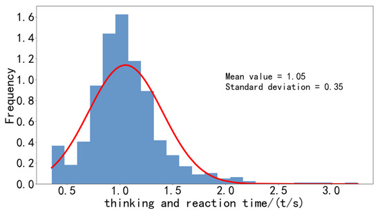 After determining the thinking time, the speech data was subjected to a deeper analysis, focusing primarily on its dialogue structure. This involved converting the speech data into text, revealing two predominant conversation modes: (1) The crew initiates dialogue, typically pre-takeoff, seeking controller instructions for takeoff, inquiring about airport weather conditions, or confirming controller directives, with the conversation concluding after the controller’s response; and (2) The controller directly issues instructions, which the crew receives and acknowledges. Given the distinct features of the speech data, we chose to focus our research specifically on the first conversation method. The controller’s thinking and reaction time (τ1) was deduced by isolating the duration from when the crew ends the conversation using the aircraft call sign to the moment the controller begins their response. The time data were then plotted and analyzed using histograms, as depicted in Figure 8. The results indicate that most controllers’ thinking and reaction times cluster between 0.8–1.5 s, with instances exceeding 2.5 s being rare. These longer durations typically occur during English conversations, highlighting a comparative weakness in controllers’ responses to English and suggesting a need for enhanced language training. Adhering to the 3σ criterion of normal distribution, this study considers 2.1 s as the average value for the controllers’ thinking and reaction times.