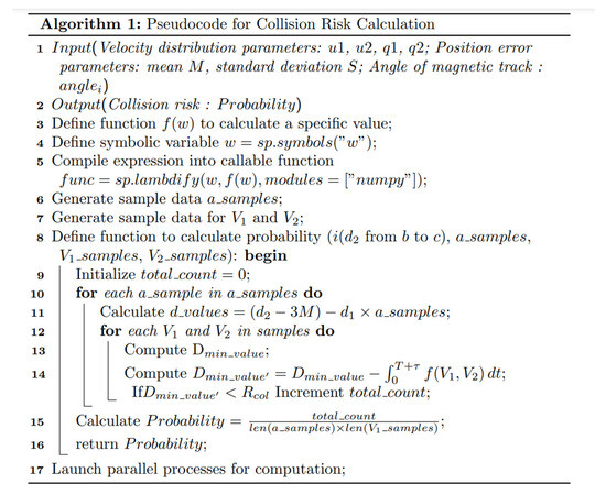 In the simulation process of this paper, once given a starting leading aircraft distance from the intersection position , the collision probability between two aircraft in a given scenario can be calculated by simulating the trailing aircraft at different distances from the intersection (). First, this paper takes the initial state at = 10 km to simulate the risk of collision for different positional errors through the pseudo-code shown in Figure 9. Second, for the special scenario of , varying values are taken for each magnetic course to investigate the influence of the route angle before crossing the intersection point and the projection angle after crossing the intersection point on the collision risk, highlighting the significance of route configuration in airspace operation safety. Then, after briefly discussing the parameters of the normal distribution that the speed obeys, the distribution function of the speed is expanded, and its influence on the collision risk is discussed in the light of the function’s characteristics. Finally, the simulation results of collision risk under different human-operated adjustment times are used to discuss the effects of controllers’ and pilots’ reactions as well as aircraft maneuvers on the safe separation of the trailing aircraft from the intersection.