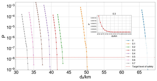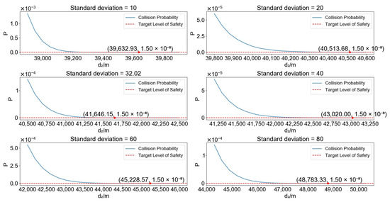 Under current regulations, the leading aircraft’s speed at the intersection should not be less than that of the trailing aircraft, and cruising speeds at the same altitude are generally considered uniform. To further investigate the impact of speed variability on collision risk, scenario simulations are conducted with the assumption that both aircraft’s speeds have the same mean value and variable standard deviation. Figure 13 illustrates the relationship between the collision risk, the distance of the trailing aircraft from the intersection at the beginning, and the standard deviation. On the one hand, it can be clearly seen that the larger the standard deviation is, the larger the corresponding collision risk will be when the trailing aircraft is at the same distance from the intersection. The larger standard deviation indicates that the speed values are taken with a better discretization, which means that they will be mapped to different hash values and have a greater impact on the safety of the operation. On the other hand, it can be found that the smaller the standard deviation, the greater the rate of change of collision risk with distance, and given the TLS, it can be found that its corresponding distance from the trailing aircraft to the intersection will be smaller, which means that the more stable the cruising speed on the airway is, the higher the safety will be, and the safe separation that needs to be maintained will be reduced.